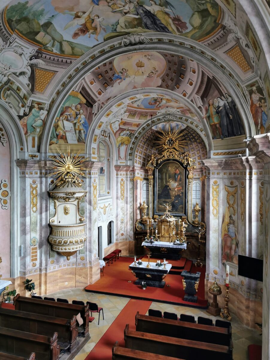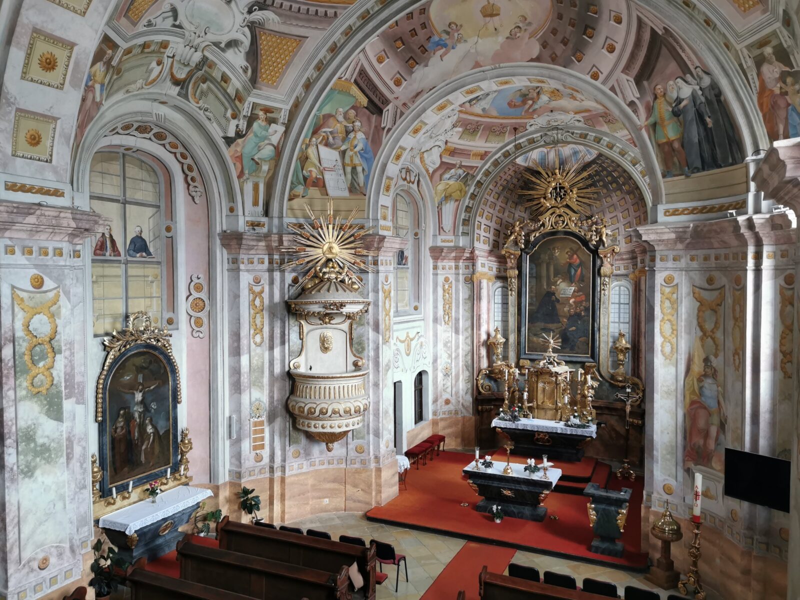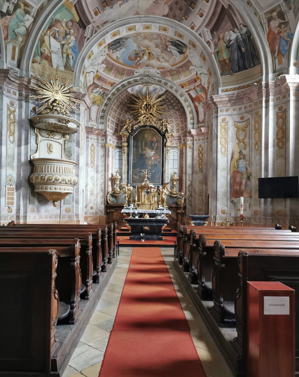 „Álkupolával, perspektivikus rövidülésekkel, festett oszlopokkal és hasonló eszközökkel érte el a művész, hogy az alapvetően kicsi és egyszerű tér hatásosan tagolt, nemes anyagokkal díszített, nagyszabású látszatot keltsen.” (Fotó: Thaler Tamás)