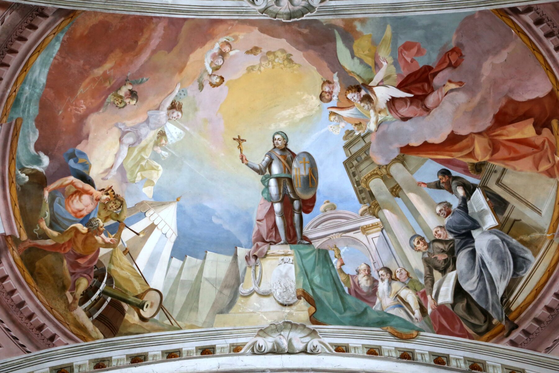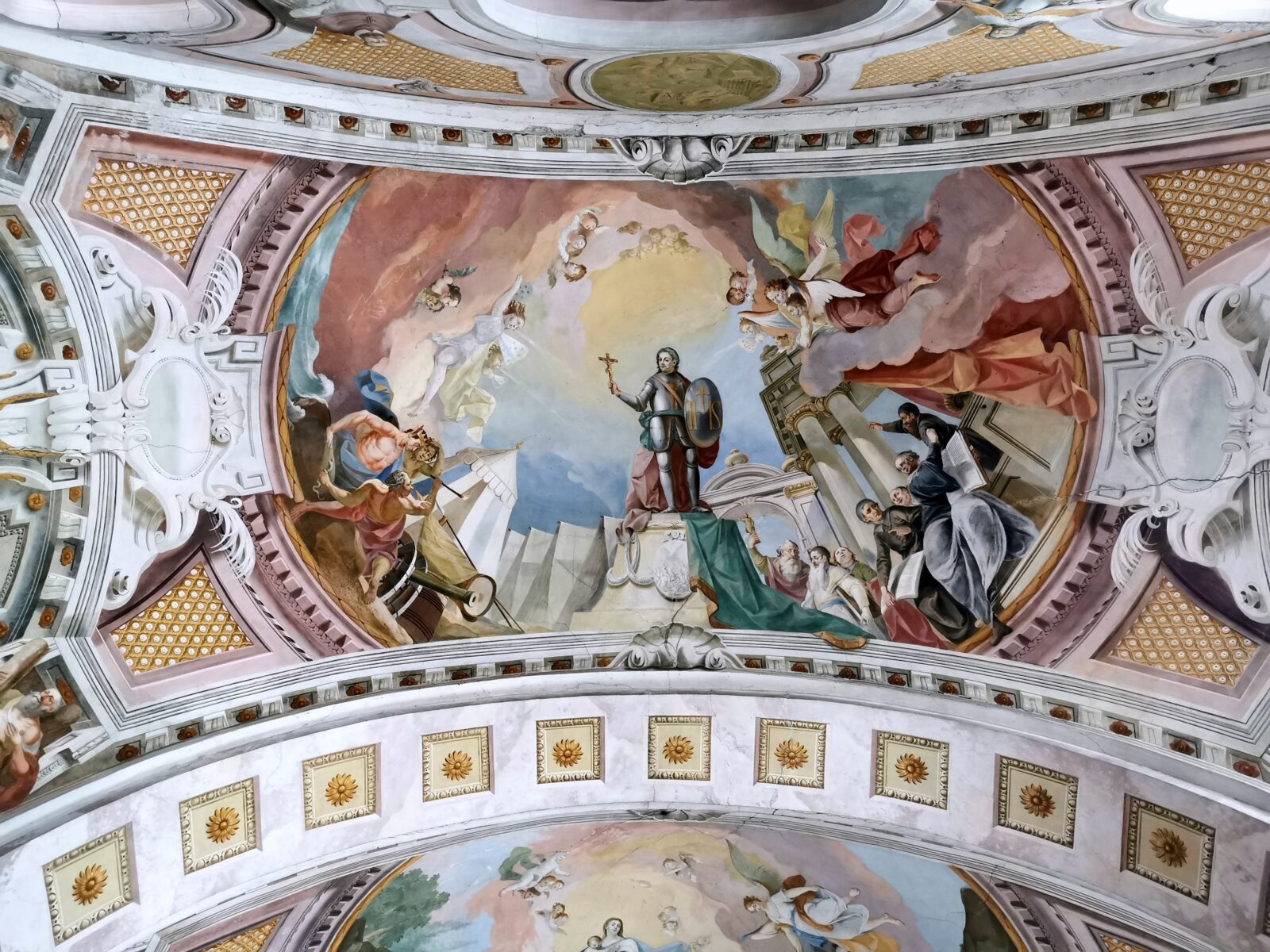 A mennyezeti freskók programja Szent Ignác életének három legfontosabb állomását fogja át a bejárattól a szentély felé haladva. Az első kép ifjú katonaként ábrázolja, amint a bűnök allegóriái ellen hadakozik. A másodikon épp lelkigyakorlatos könyvét írja; angyalok veszik körül, felette látható Mária a gyermek Jézussal és a négy evangélista. A harmadik, már a szentély fölötti mennyezetszakaszon a rendalapító megdicsőülését jeleníti meg a freskó: angyalok emelik magasba a szentet, akit a Szentháromság, azaz az Atya, a Fiú és a galambbal szimbolizált Szentlélek ölel magához. Kétoldalt jezsuita szentek veszik körül – Xavéri Szent Ferenc, Gonzága Szent Alajos – és a három kassai vértanú, Pongrácz István, Grodecz Menyhért, Kőrösi Márk, ami igazán különlegessé teszi a festményt, hiszen amikor készült, a vértanúk még csak boldoggá sem voltak avatva. Tiszteletüket minden bizonnyal Nagyszombatból hozta magával Buffleur páter. Természetesen a főoltárképen is Loyolai Szent Ignác látható, a híres La Storta-i látomása közepette. A rendalapítót a művész könyvvel a kezében ábrázolja, melyen a jezsuita rend jelmondata olvasható: „Omnia ad maiorem Dei gloriam”: Mindent Isten nagyobb dicsőségére.