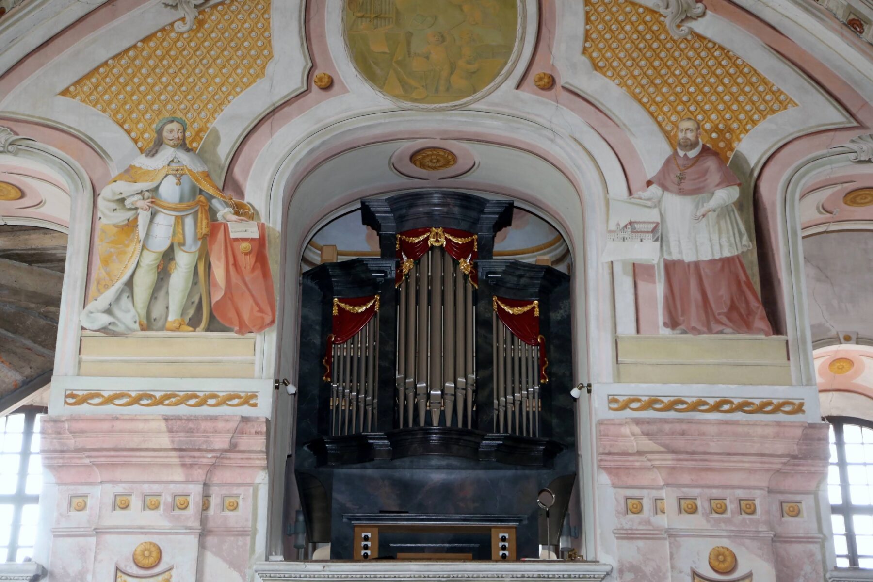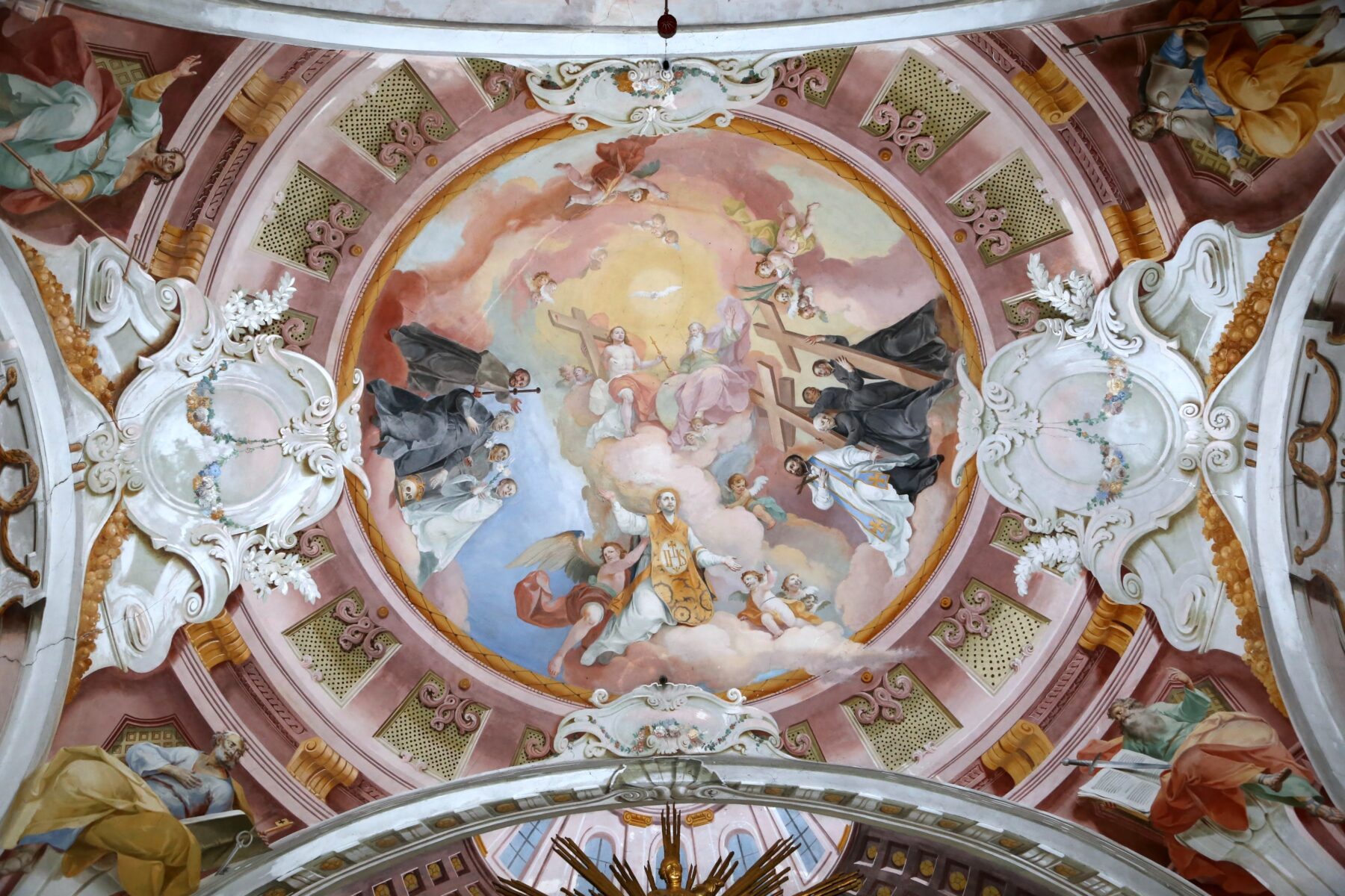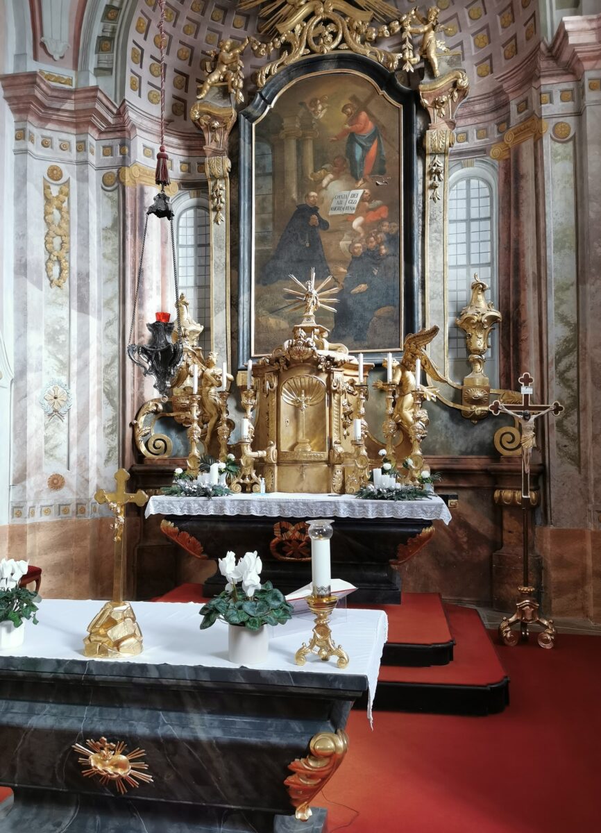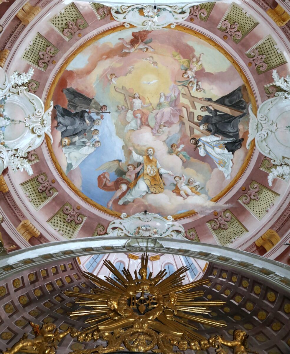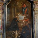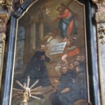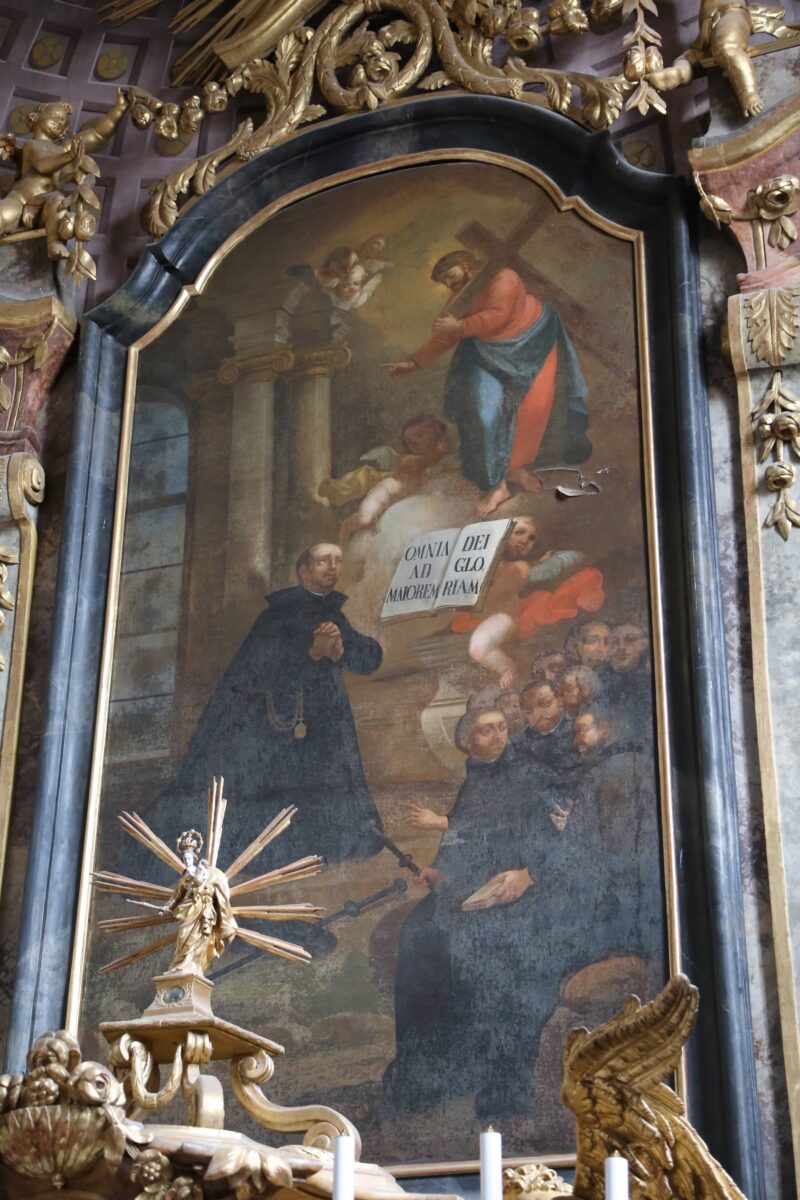 Kétoldalt jezsuita szentek veszik körül Szent Ignácot – Xavéri Szent Ferenc, Gonzága Szent Alajos – és a három kassai vértanú, Pongrácz István, Grodecz Menyhért, Kőrösi Márk, ami igazán különlegessé teszi a festményt, hiszen amikor készült, a vértanúk még csak boldoggá sem voltak avatva. (Fotó: Thaler Tamás)