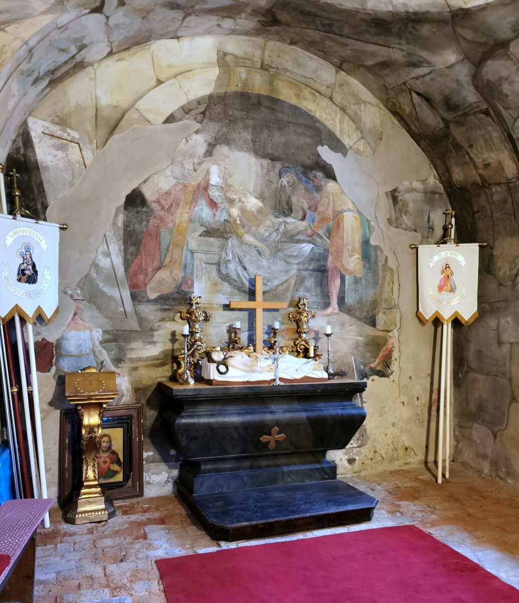 A barokk templom következetes ikonográfiáját szemlélve meglepő, hogy a Szent Sír-kápolnában nincs korabeli jezsuita nyom. A Kőnig és Torkovits veszprémi kőművesmesterek által épített kápolna a templom északi oldalához kapcsolódik, és a sekrestyéből közelíthető meg. A nedves falak miatt az itteni falképek sérültek a leginkább, ezért inkább csak sejtjük, hogy az egyik oldalon Jézus sírba tételét, a másikon az Olajfák hegyén vérrel verejtékező Krisztust láthatjuk három apostol társaságában, akik alszanak. A képeken feltűnnek még azok az asszonyok, akik először fedezték fel, hogy a Megváltó feltámadt. A kis kápolna képein feltűnik Mózes és az égő csipkebokor is.