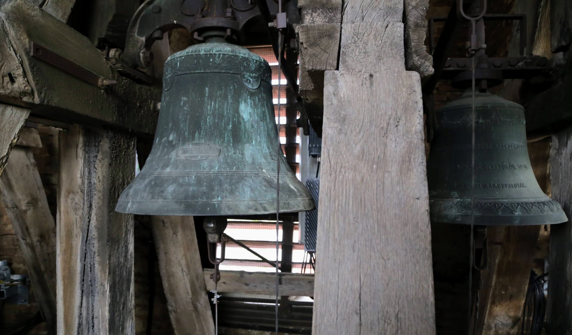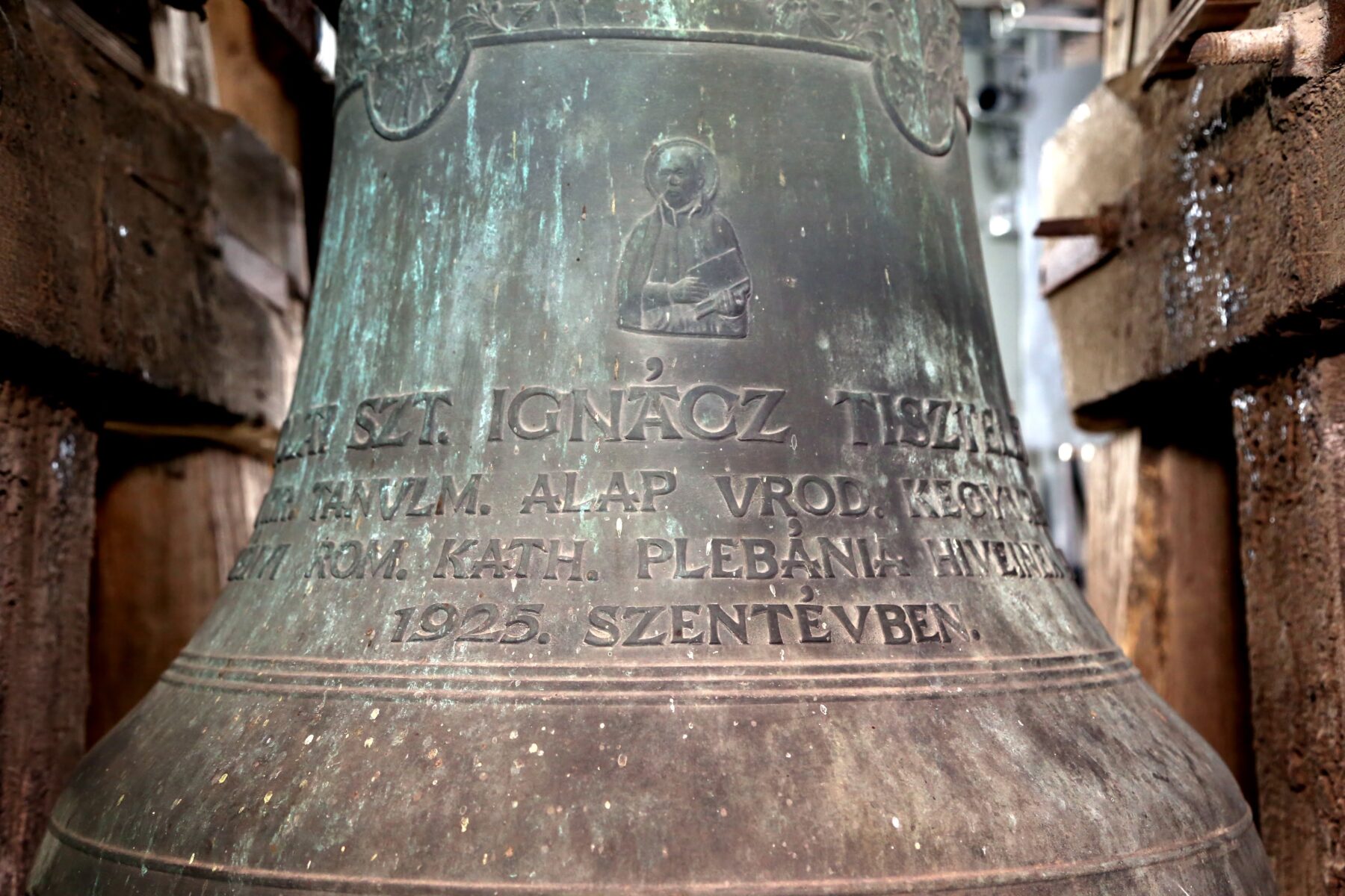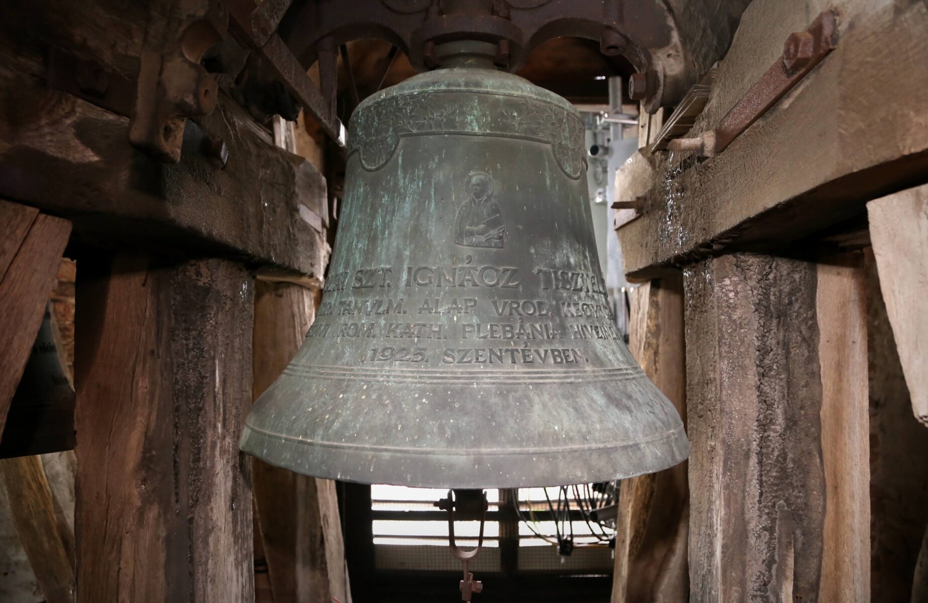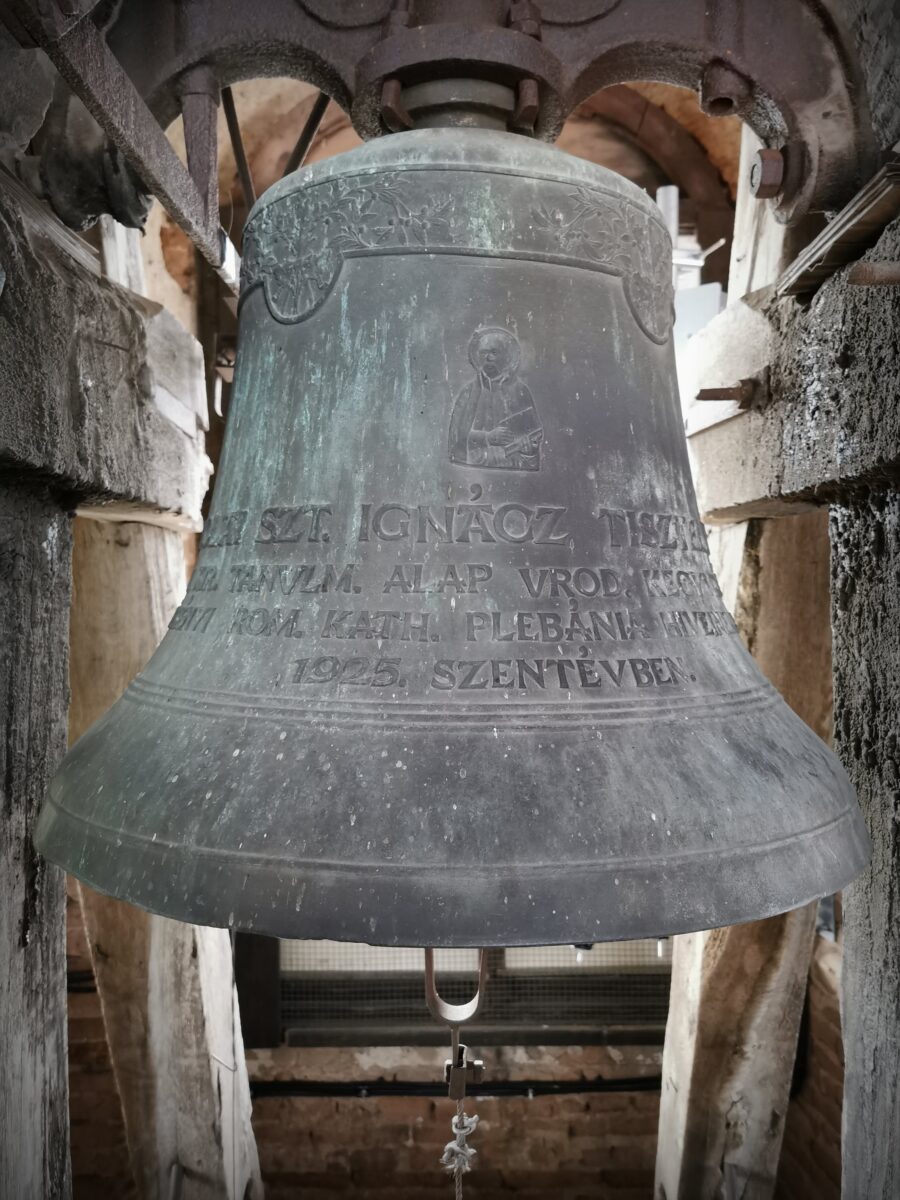 A templom eredeti harangjai már nincsenek meg, ám minden bizonnyal jezsuita szentek nevét viselték. A meglévők közül a legnagyobbat Szent Ignác tiszteletére szentelték 1925-ben. Az is olvasható rajta, hogy az „Ecclesia Harangművek Rt. öntött engem F. W. Rincker által.” (A cég az első világháború után, a megsérült, illetve beolvasztott harangok pótlására alakult. Fritz Wilhelm Rincker Csepelen, a Weiss Manfréd gyár egyik üres műhelyében rendezett be harangöntödét, és ott dolgozott 1927 végéig.)