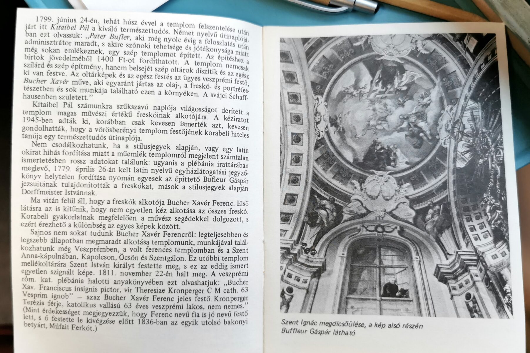 Az oltárképek és az egész festés az ügyes veszprémi festő, Bucher Xavér [Ferenc] műve, aki egyaránt jártas az olaj-, a freskó-és portréfestészetben, és sok munkája található ezen a környéken. A svájci Schaffhausenben született.” Nem sikerült kideríteni, ki tervezte az épületet, de alakját minden valószínűség szerint megörökítette a falfestmények alkotója: ő az, aki kezében a kolostor alaprajzát tartja. A diadalív freskóján látszik a tervezett vörösberényi jezsuita központ a maga teljességében: az alaprajz és „látványterv”, amely a diadalív freskóján szerepel, a templomhoz csatlakozó épületegyüttest háromszárnyúnak mutatja. (Páter Buffleur alighanem nagyformátumú hitszónok és szervező lehetett, előző állomáshelyén, Székesfehérvárott a városi legendárium szerint a Szent István-templom újjáépítésére buzdította igen hatékonyan a helybéli híveket az 1750-es években.)