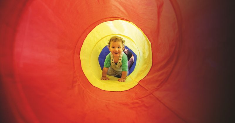 Itt nem egyszerűen csak kúszik a legkisebb. Egy képzett óvónő, Hajnalka (a gyerekház vezetője) dicséri, biztatja, segíti, miközben a rózsaszín rugdalózóba öltöztetett kislány közelebb és közelebb húzza magát a színes csörgőhöz. A járni tudókkal épp a másik munkatárs, Anett foglalkozik. A gyerekeknek az a feladata, hogy egy színes mászóalagúton haladjanak át. A játék a mozgáskultúrát és a térérzékelést is fejleszti.