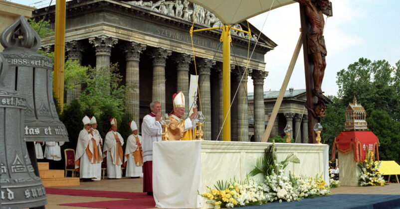 Nyitókép: Budapest, 1991. augusztus 20. János Pál pápa Szent István-napi misét celebrál a Hősök terén. (MTI Fotó / Szebellédy Géza)