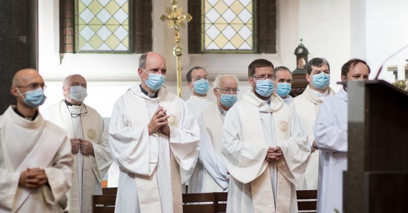 „Apa, miért takarja el itt mindenki az orrát és a száját?” Elképzelhető, hogy száz év múlva, amikor a Covid–19-vírusnak már se híre, se hamva, mégis ezt a kérdést suttogják majd templomainkban a kisgyerekek. A maszkot ugyanis a jelek szerint ugyanazzal az ösztönös liturgikus érzékkel fogadja az egyház, mint annyi más ruhadarabot sok évszázad óta. Bár a papi kollárét utánzó maszk inkább vicces ajándék lehet (rendtársam a pappá szentelésére kapott egyet a minap), a liturgikus színeknek megfelelő maszkok már kaphatók a papok öltöztetésére szakosodott – nem magyarországi – üzletek némelyikében. Megjelent a kereslet! Hiszen kézenfekvő, hogy amikor zöldben misézünk, legyen a maszk is zöld. A beöltözés így egy-két mozdulattal több figyelmet igényel, liturgikus megjelenésünk mégis sokkal méltóbb lesz, mint ha az oltár körül állókról egy műtéthez beöltözött orvoscsapat jut a hívek eszébe.
