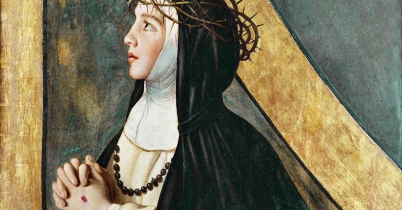 Nappalinkban a képe. Lehajol a rászorulókhoz, naponta látom, naponta érint meg a tekintete, naponta figyelmeztet saját kisszerűségemre. Most, járvány idején pláne sokat gondolok rá. Amikor Sienában a miénknél sokkal rosszabbra fordultak az események, Katalin életét is kockára téve ápolta a betegeket, többeket markáns csodákkal gyógyított meg a pestisből. Egy ilyen kegyelem által történt, felfoghatatlan felépülés után, egy sötét, álmatlan és misztikus éjszakán megjelent előtte Krisztus, aki két koronát tartott a kezében: egy tövisből fontat és egy csillogó aranykoronát. Katalin nem csodálkozott akkor sem, amikor a Megváltó ezt a határozott kérdést intézte hozzá: „Melyiket akarod választani a földi életre? Mert a másikat az égben fogod viselni.” Katalin kikapta Krisztus kezéből a töviskoronát, és azonnal a fejére tette. A tövisek fájdalmasan beleszántottak a bőrébe-húsába, s még hosszú ideig érezte-fájlalta, de igazából nagyon is szerette, mert erre a furcsa és gyönyörű misztikus találkozásra emlékeztette minden pillanatban.
