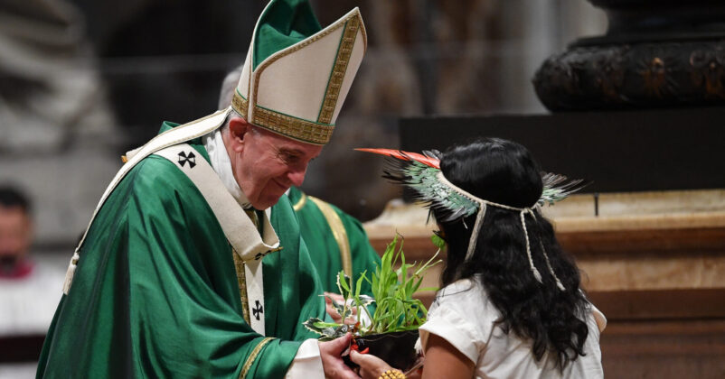 Nyitókép: Egy őslakos növényt ajánl fel a szentatyának az Amazóniában tartott szinódus zárómiséjén (Andreas Solaro / AFP)